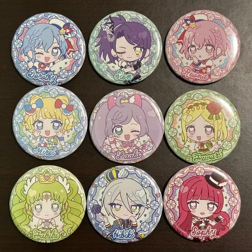 프리파라의 캬라핀 캔뱃지 9개 세트입니다. 개봉하여 미사용 상태이지만, 한 번이라도 사람의 손을 거친 물건임을 양해 부탁드립니다. #프리파라 #캬라핀 #캔뱃지 #라라 #미레이 #소피 #시온 #도로시 #레오나 #히비키 #파루루 #후와리