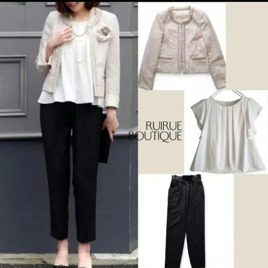 루일 에 부티크 RUIRUE BOUTIQUE의 노카라 트위드 자켓 & 상의 & 테이퍼드 팬츠 & 코사지 4종 세트업 포멀 세레모니 수트입니다.