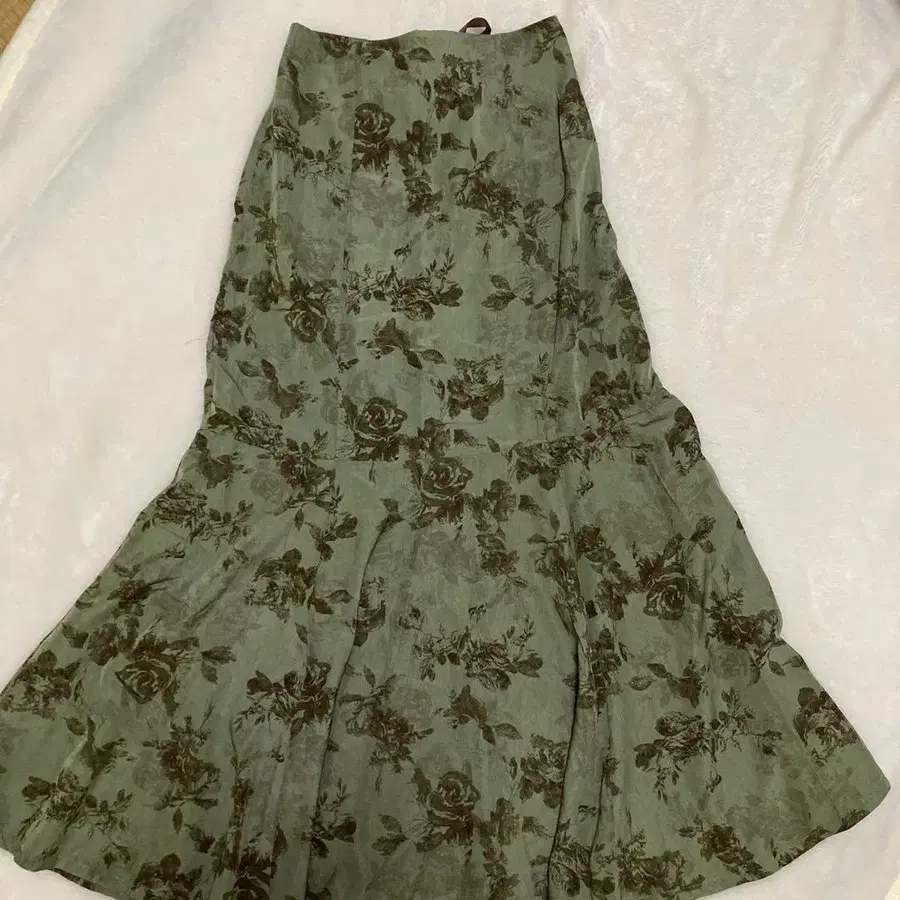 카키색에 브라운 로즈 패턴의 롱 플레어 스커트입니다.