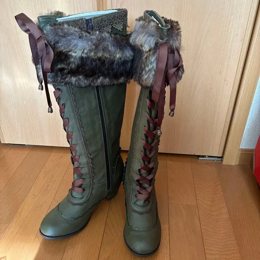 *미사용 새상품 *L 사이즈 ( 24~24.5cm ) *컬러: 카키 *퍼는 탈부착 가능 *입구에 레이스 장식 *힐: 약 6cm *전체 길이: (입구부터 힐까지) 44cm *정가 (세금 별도) 8900엔