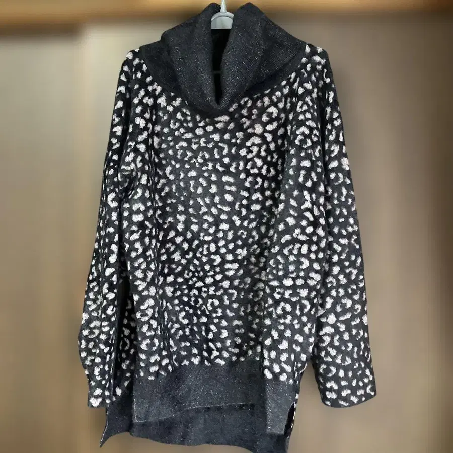레오파드 무늬 하이넥 니트, 블랙과 베이지의 대비가 특징.