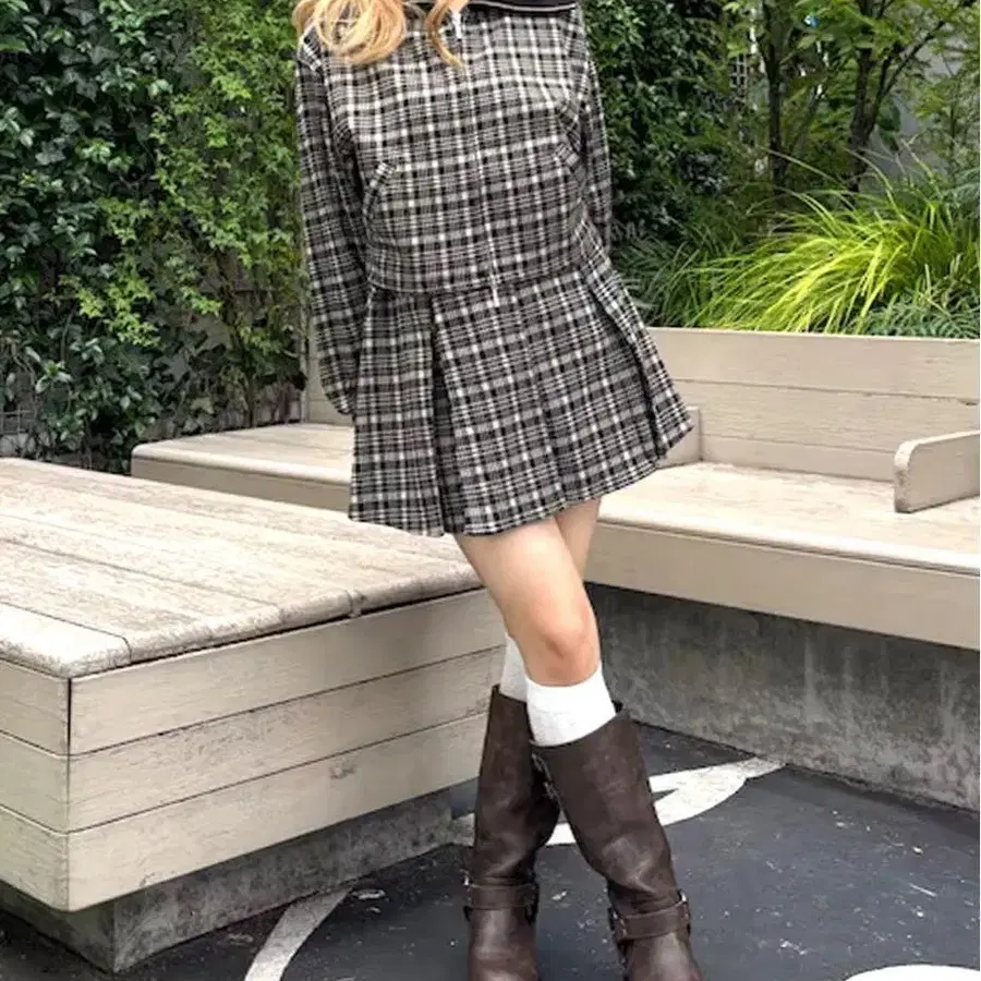 체크 니트 블루종 셋업