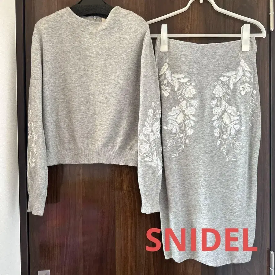자수가 들어간 니트탑 & 니트 스커트 세트입니다.