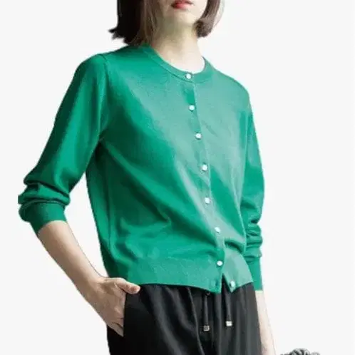 선명한 그린 색상의 OPAQUE.CLIP 가디건, 심플하고 스타일리시한 디자인.