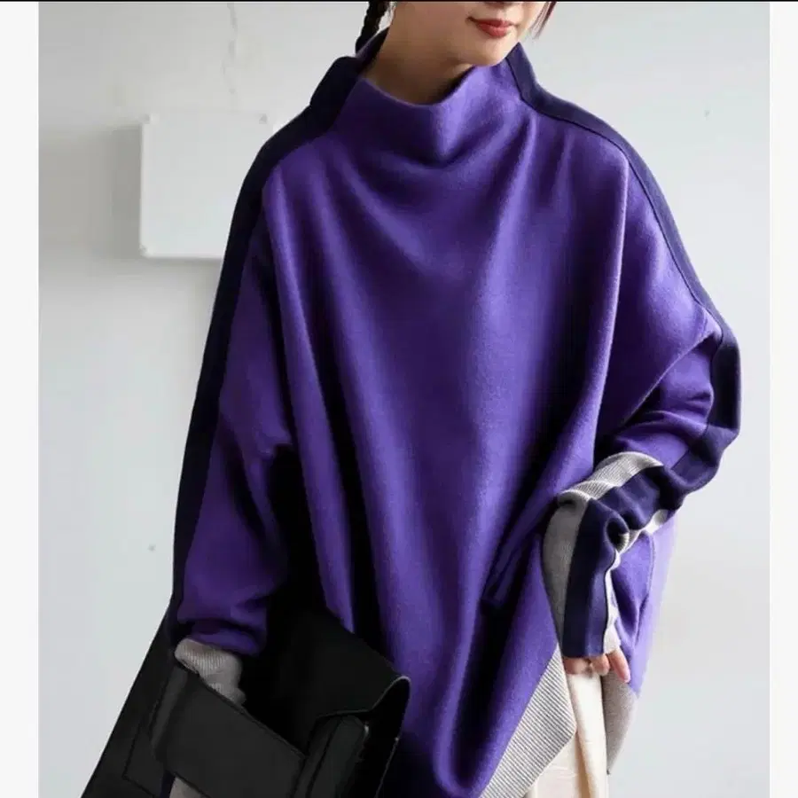 antiqua 배색 절개 하이넥 니트 풀오버 퍼플