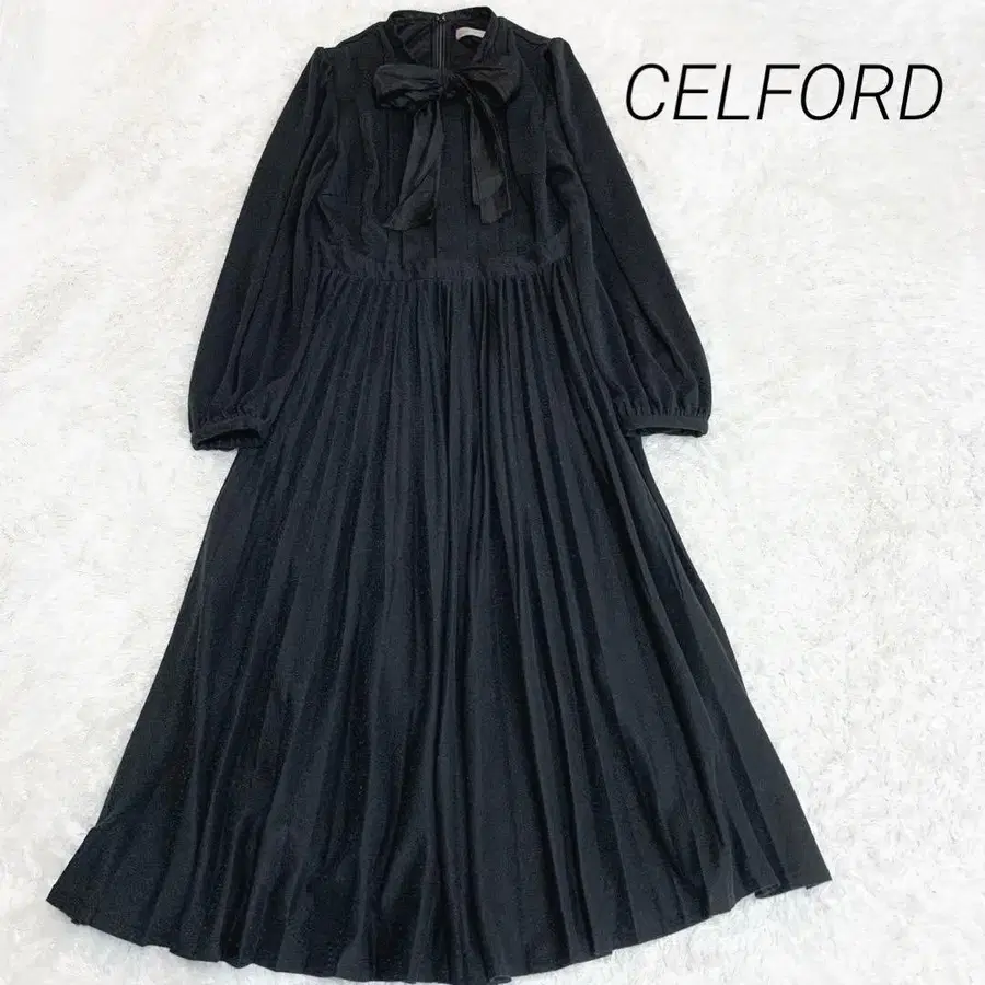 셀포드 롱 원피스 보타이 라메 플리츠 플레어 블랙