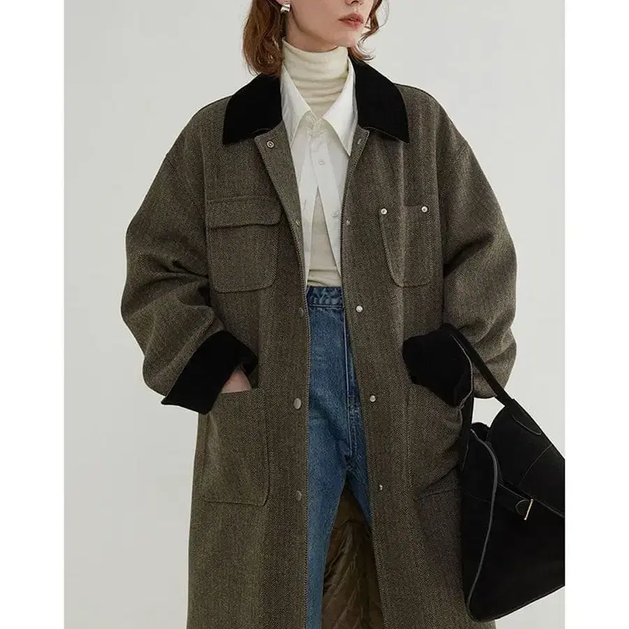 울 혼방 헤링본 무늬 롱 코트, 프론트 버튼과 포켓이 있어 실용적입니다.