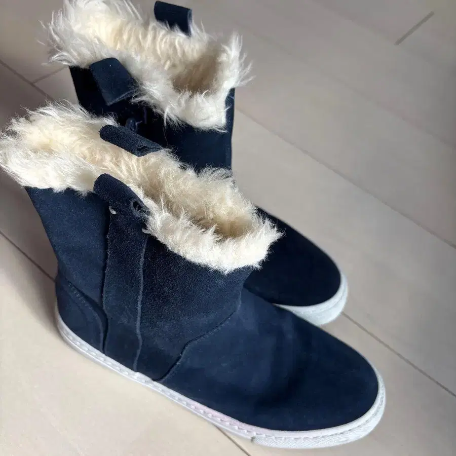네이비 색상의 스웨이드 소재로, 퍼 안감의 숏부츠입니다. - 색상: 네이비 - 소재: 스웨이드 - 안감: 퍼 - 디자인: 숏부츠 - 밑창: 러버 솔 방문해 주셔서 감사합니다. 사이즈 - 23cm