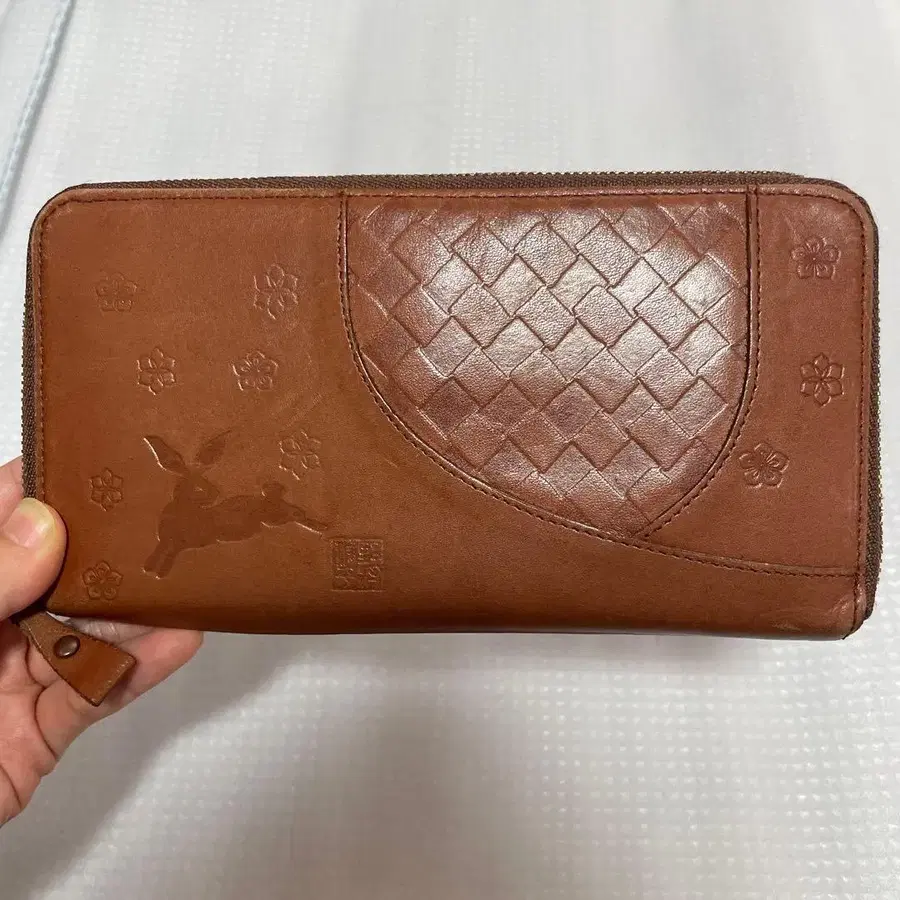 브라운 색상의 가죽 장지갑, 뜨개질 디자인으로 수납력 뛰어남.