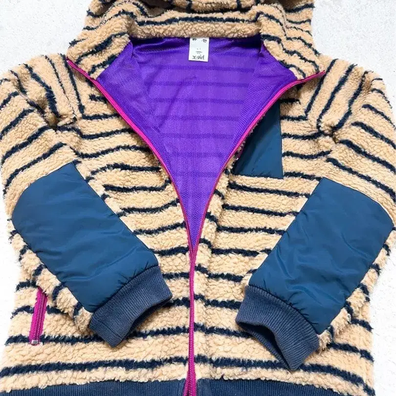 스트라이프 패턴의 플리스 자켓, 후드 부착 및 지퍼 포켓 부착. - 브랜드: X-GIRL equipment - 디자인: 스트라이프 패턴 - 색상: 베이지/네이비 - 소재: 플리스/나일론 - 후드: 후드 부착 - 포켓: 지퍼 포켓 부착 - 지퍼: 핑크색 지퍼 방문해 주셔서 감사합니다. 사이즈 - M