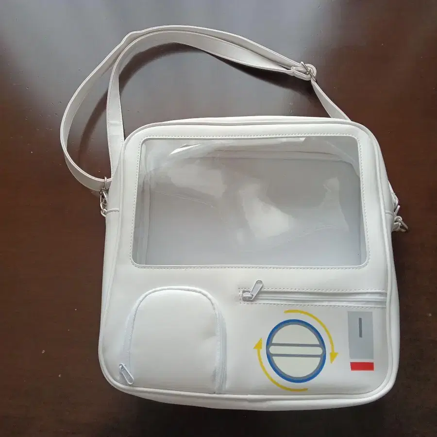 합성 피혁 소재의 화이트 숄더백, 투명 포켓 포함.