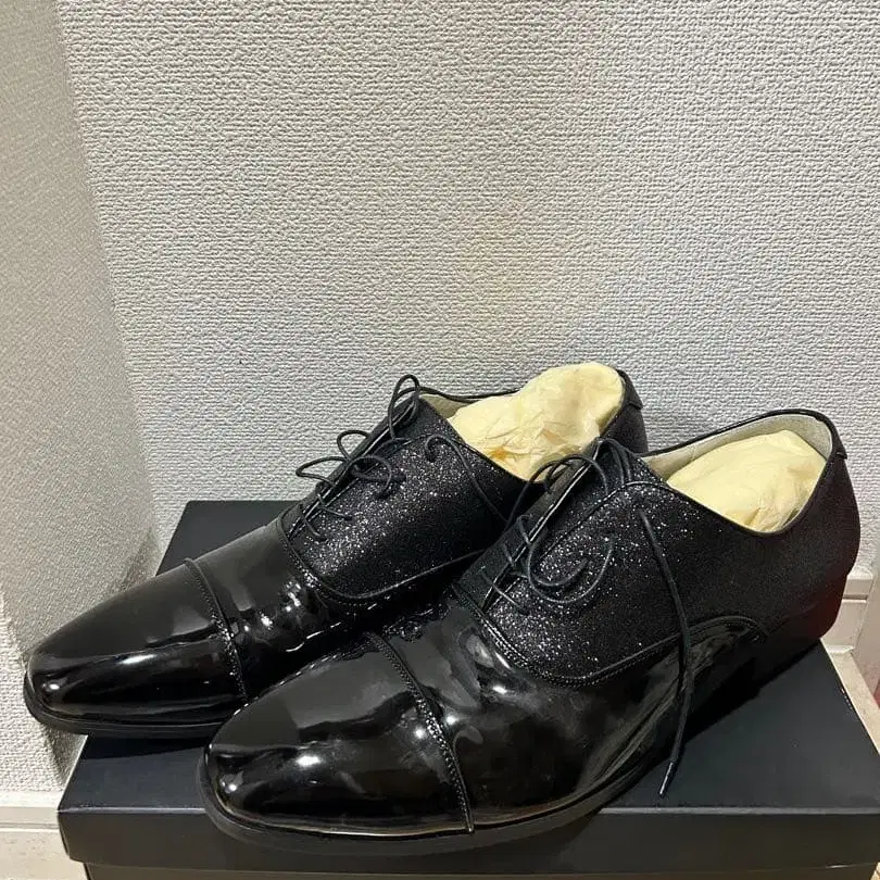 블랙 드레스 슈즈 결혼식장에서 계약 혜택으로 받았으나 의상에 맞춰 다른 신발을 렌탈했기 때문에 시착만 한 미사용 상품입니다. - 사이즈: 28cm - 디자인: 부분적으로 라메 장식 방문해 주셔서 감사합니다.