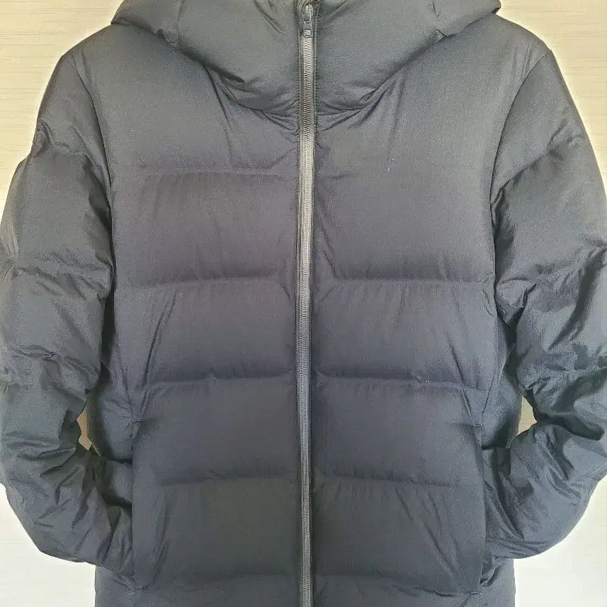 후드 부착 블랙 다운 자켓, 사이즈 M, 보온성이 뛰어난 디자인.