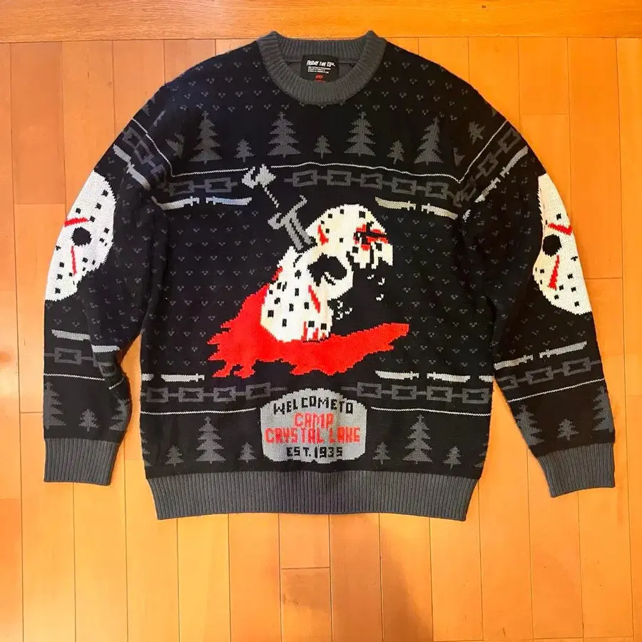 스키 스웨터풍 디자인으로, 호러 영화 <13일의 금요일>의 오피셜 니트 스웨터 - 브랜드: Mondo Friday the 13th - 사이즈: L (일본 XL 정도) - 기장: 69.5cm - 가슴 너비: 57.5cm - 소매 길이: 62.5cm - 디자인: 크리스마스 스웨터풍 - 색상: 블랙/그레이/빨간색 - 소재: 아크릴 니트 방문해 주셔서 감사합니다.