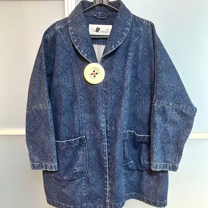 큰 버튼이 달린 데님 자켓, 앞면에 2개의 포켓이 있습니다.