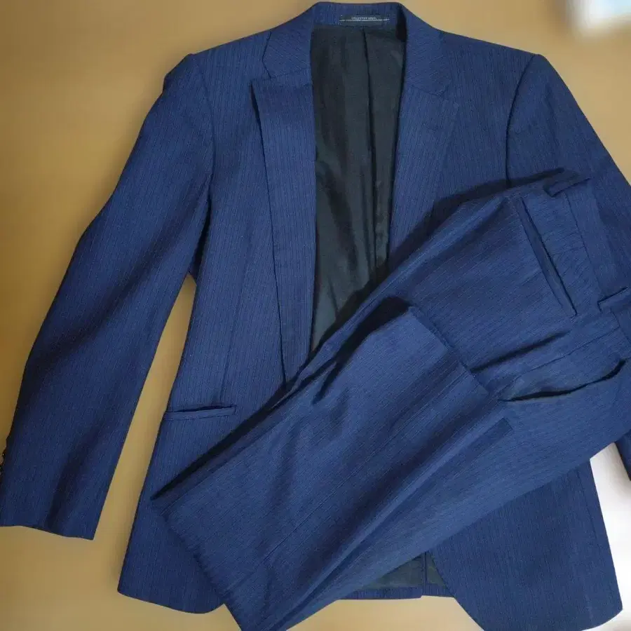 네이비 스트라이프 디자인의 비즈니스 정장. - 색상: 네이비 - 디자인: 스트라이프 - 안쪽 포켓: 있음 - 자켓 타입: 싱글 - 팬츠 타입: 슬랙스 슬랙스 포켓 등에 사용감 있습니다. 방문해 주셔서 감사합니다.