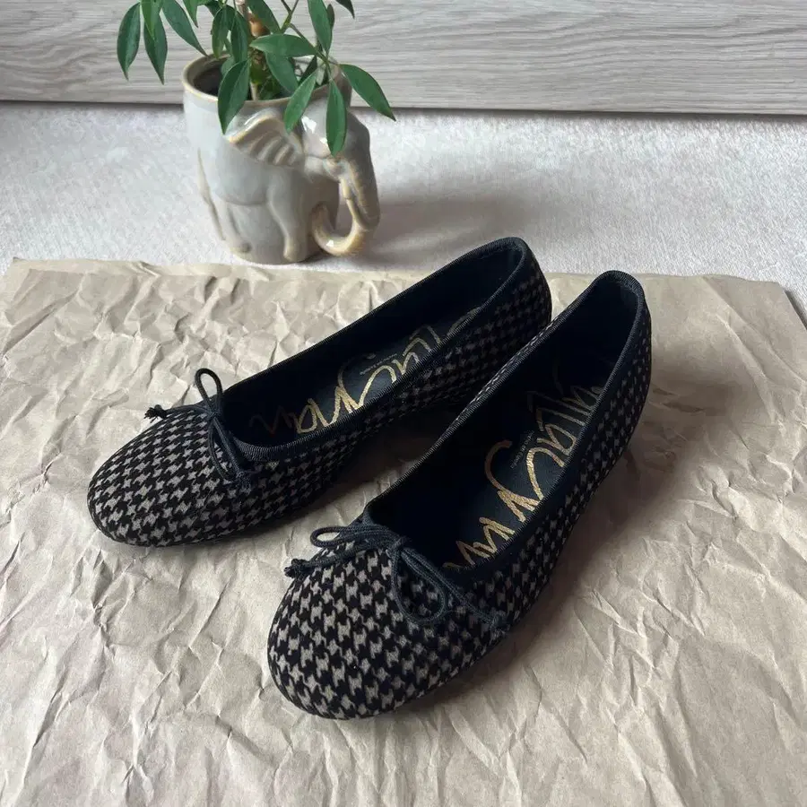 셀렉샵에서 구매했습니다. 많이 사용하지 않아 새상품급입니다. 하운드투스 패턴, 베이지 x 블랙의 클래시컬한 플랫슈즈. 백 스타일의 베이지 라인이 악센트가 되어 있으며, 3cm 정도의 인솔이 들어 있습니다. 스페인산