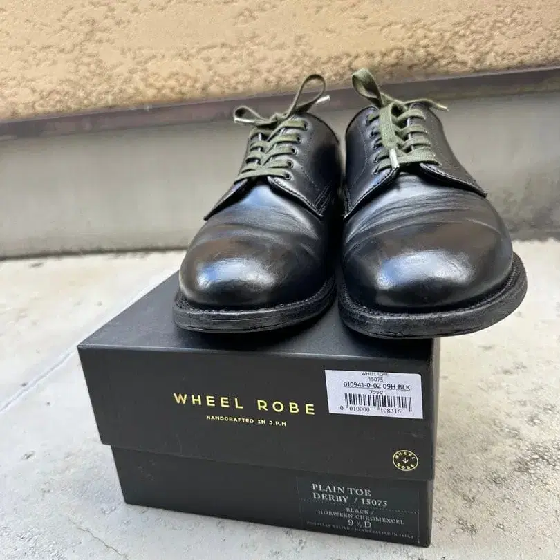 블랙 색상의 플레인 토 슈즈, 올리브 그린 색상의 신발끈 포함.