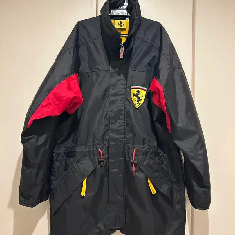 자동 번역되었어요. 원문보기페라리 자수 로고가 특징인, 블랙과 레드 색상의 콤비네이션 아우터.