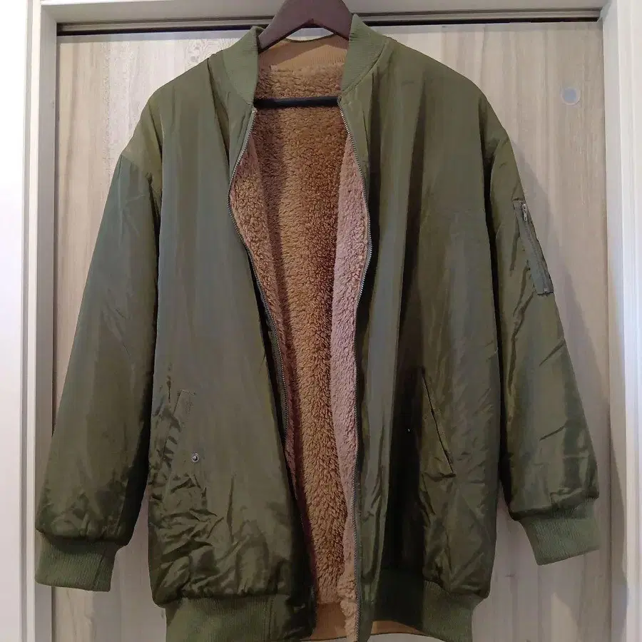 올리브 그린 MA-1 스타일 자켓, 안쪽 보아 소재로 따뜻함을 제공합니다.