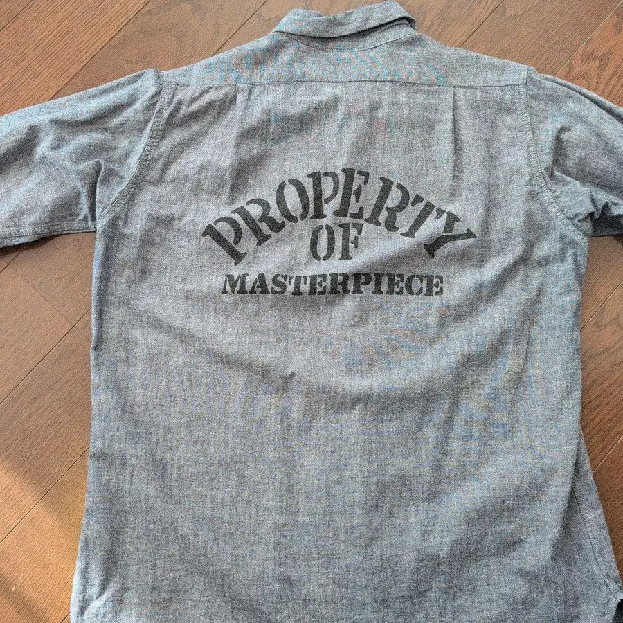 PROPERTY OF MASTERPIECE의 백 디자인이 특징적인 그레이 색상의 긴팔 셔츠입니다.
