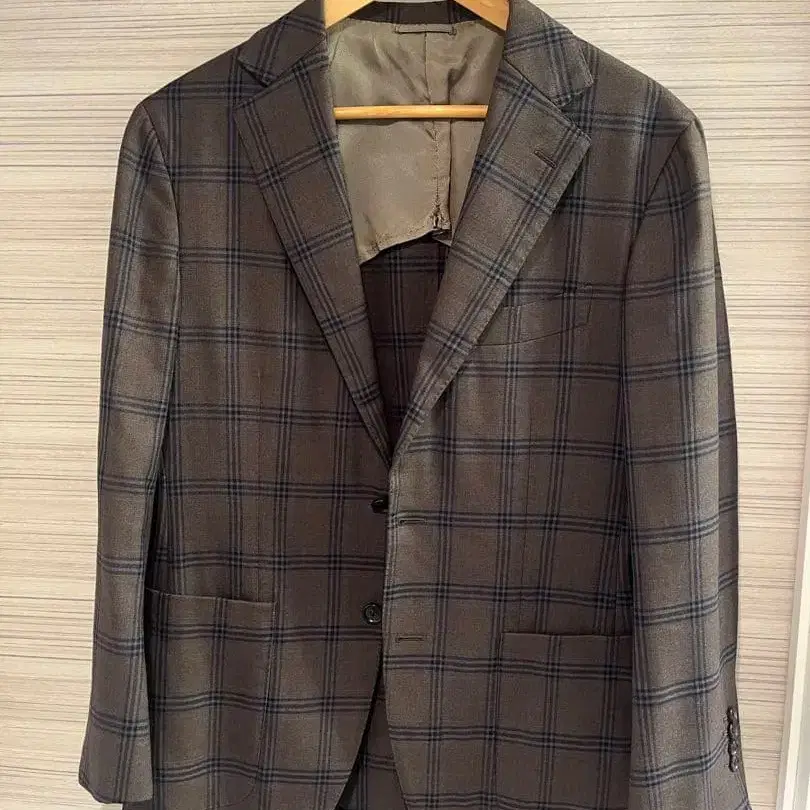 커스텀 테일러 빔즈의 오더 자켓입니다. 사이즈는 46을 베이스로 소매 길이를 수선한 느낌입니다. 브라운 바탕에 스카이블루 체크가 포인트인 원단입니다. 어깨 너비 43 가슴 너비 49 기장 73 소매 길이 60 잘 부탁드립니다.