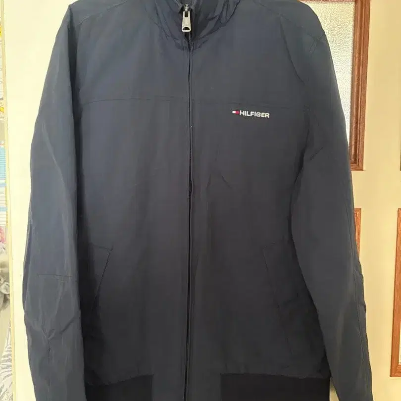 심플하고 스타일리시한 네이비 색상의 나일론 자켓, TOMMY HILFIGER의 M 사이즈입니다.