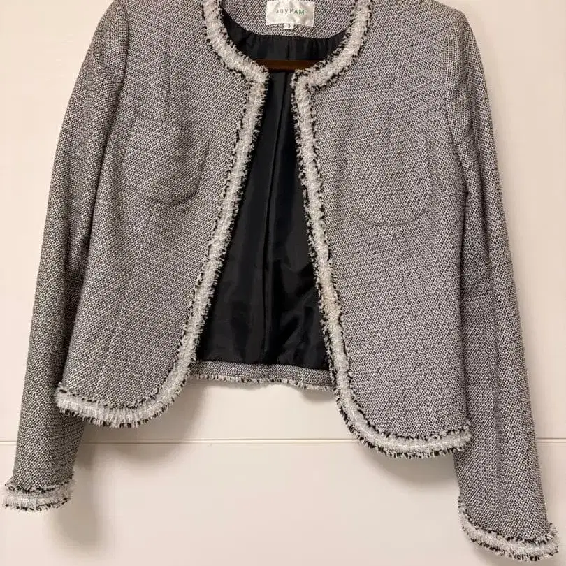 프린지 장식이 특징인 그레이 노카라 자켓. 사이즈감은 4번째 사진을 확인해 주세요. 몇 번 착용한 후 보관했습니다.