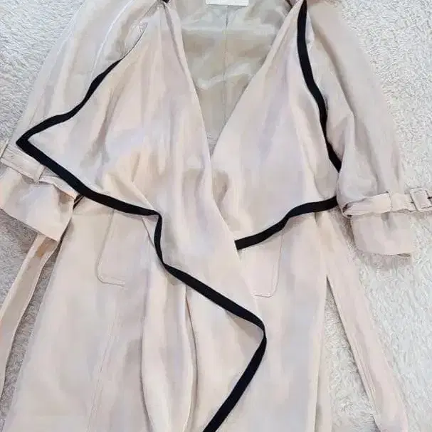 블랙 트리밍이 특징인 베이지 랩 코트. - 색상: 베이지 - 디자인: 블랙 트리밍 - 스타일: 랩 스타일 - 포켓: 앞면에 포켓 있음 - 소매: 롤업 가능한 소매 방문해 주셔서 감사합니다. 사이즈 - FREE SIZE
