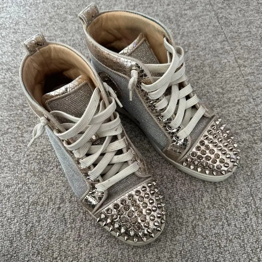 스터드가 달린 실버 하이컷 스니커즈. - 색상: 실버 - 디자인: 스터드 장식 - 소재: 합성 피혁 - 내부: 가죽 - 스타일: 하이컷 방문해 주셔서 감사합니다.