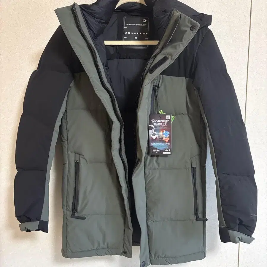 특허 기술을 사용한 X Shelter의 M 사이즈 다운 자켓, 올리브 그린과 블랙의 콤비네이션.