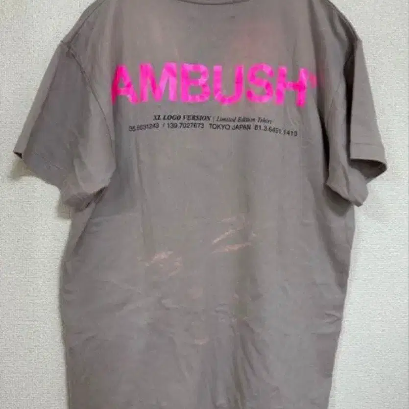 AMBUSH 그레이 T셔츠, 뒷면에 선명한 핑크 로고 프린트.