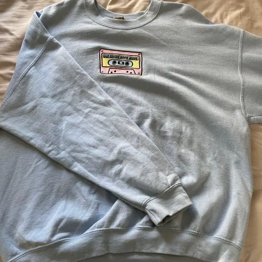 카세트 테이프 자수가 특징인 라이트 블루 트레이닝복.