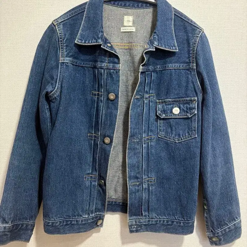 인디고 컬러의 데님 자켓입니다. 컴팩트한 사이즈로 아우터 안에 레이어드하여 착용할 수 있습니다. 사이즈 34, 기장 약 54cm, 가슴 너비 약 40cm입니다. - 브랜드: SEA - 제조국: 일본 - 색상: 인디고 - 포켓 수: 2개 - 디자인: 백 벨트 포함
