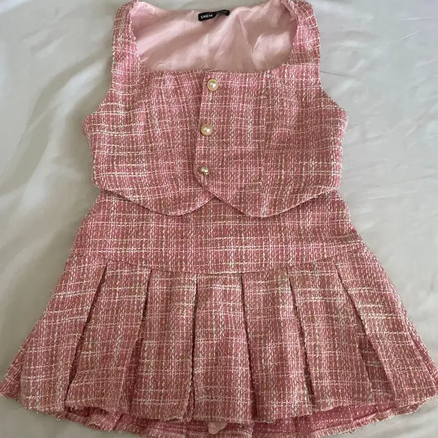 핑크 트위드 셋업 플리츠 스커트 댄스 의상