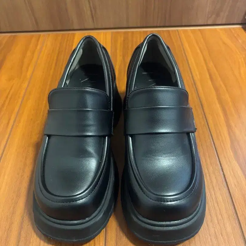 통굽 디자인의 블랙 로퍼, 합성 피혁 소재로 스타일리시합니다. 한 번 착용했지만 사이즈가 맞지 않아 판매합니다. - 색상: 블랙 - 스타일: 로퍼 - 굽 높이: 통굽 - 소재: 합성 피혁 방문해 주셔서 감사합니다. 사이즈 - 23.5cm