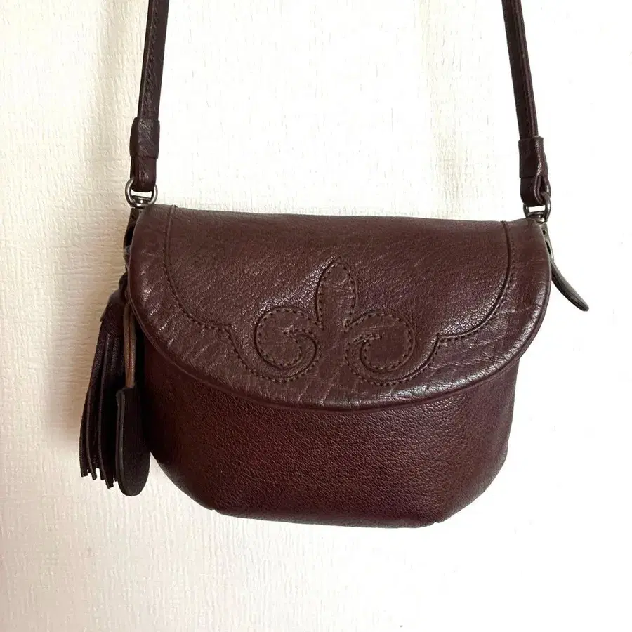 다크 브라운 색상의 가죽 숄더백입니다. 플랩과 프린지 디자인이 특징이며, 내부에 지퍼 포켓이 있습니다. - 색상: 다크 브라운 - 디자인: 플랩, 프린지 - 내부 구조: 지퍼 포켓 있음 - 소재: 가죽 방문해 주셔서 감사합니다.