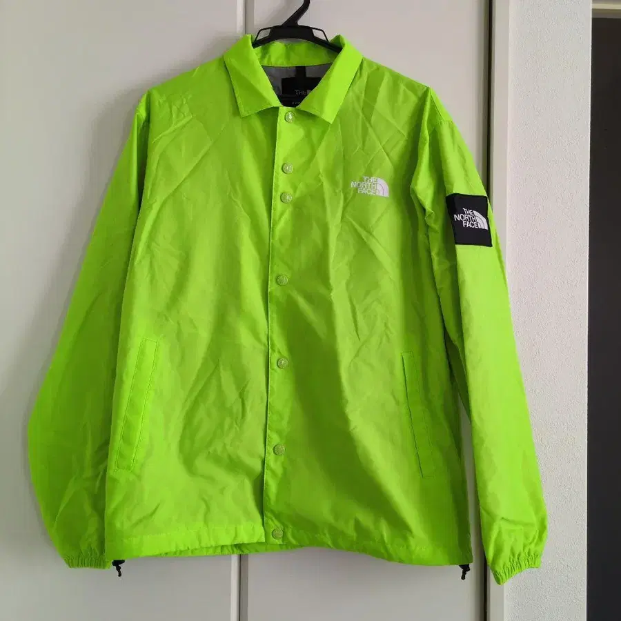 자동 번역되었어요. 원문보기형광 그린 THE NORTH FACE 자켓, 버튼식 포켓 부착.