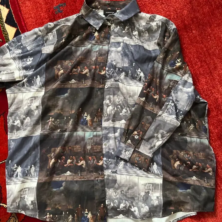 역사적인 회화를 모티브로 한 아트 프린트 캐주얼 긴팔 셔츠. 미사용 새상품입니다! - 디자인: 아트 프린트, 역사적인 회화 콜라주 - 색상: 다색 (주로 블랙, 화이트, 파랑) - 소재: 불명이나, 경량 원단 - 스타일: 캐주얼 셔츠, 긴팔 - 버튼: 전면에 버튼 있음 - 사이즈: 불명이나, 오버 사이즈로 보임 방문해 주셔서 감사합니다.