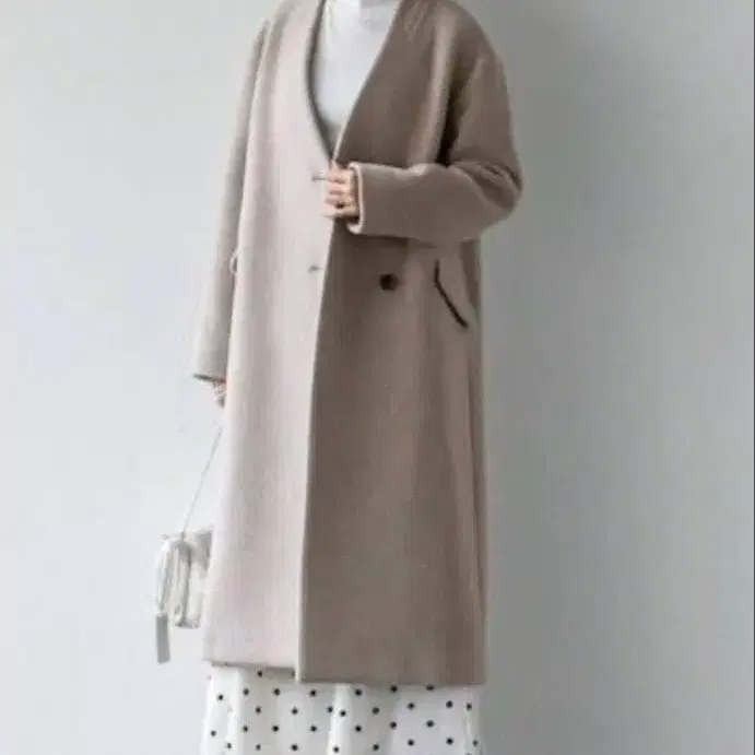 얼굴 주변을 샤프하게 보이게 하는 V넥 라인과, 적당히 둥근 코쿤 실루엣이 모던하고 엘레강트한 인상을 줍니다.