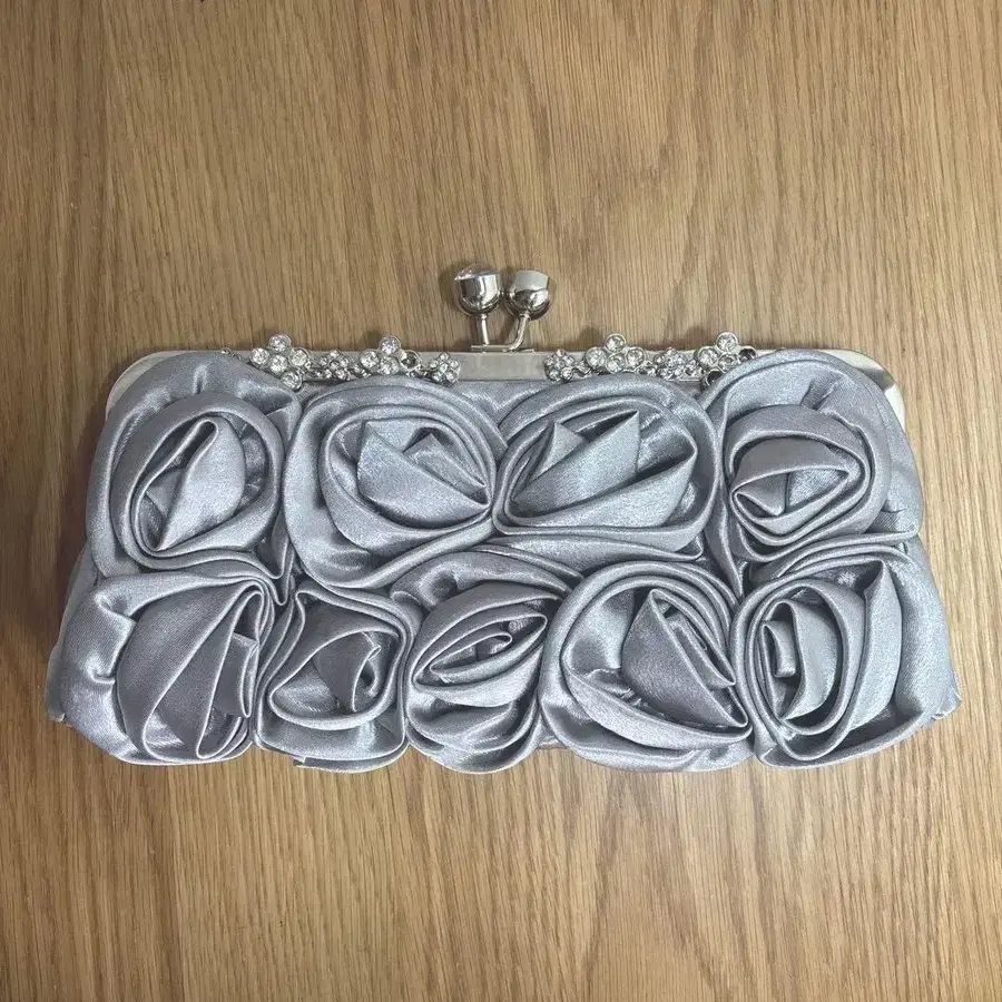 플라워 모티브의 실버 새틴 파티 백. 크기는 안경 케이스가 여유롭게 들어갈 정도입니다. - 색상: 실버 - 디자인: 플라워 모티브 - 스트랩: 체인 스트랩 - 소재: 새틴 방문해 주셔서 감사합니다. 색상 - 실버 계열 특징 - 가마구치 부속품 - 부속물 없음