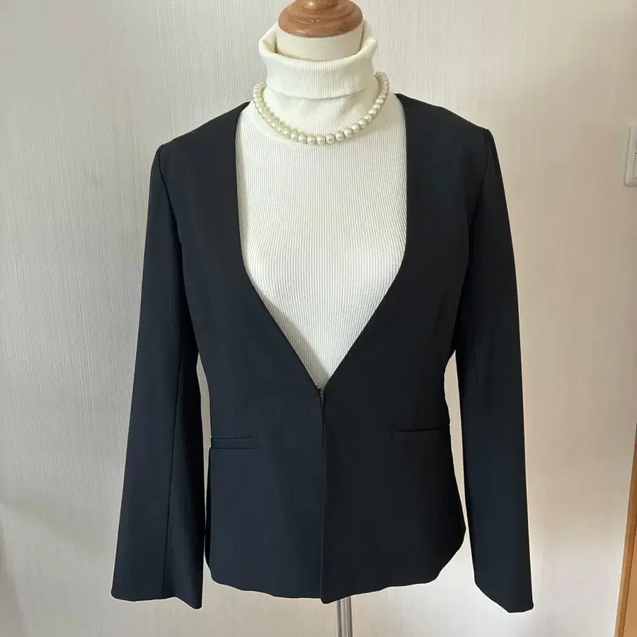 자동 번역되었어요. 원문보기심플한 노카라 디자인의 블랙 자켓, 슬림핏으로 스타일리시합니다.