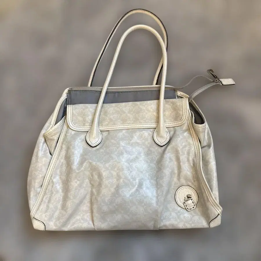 화이트 토트백, 외부 지퍼 포켓과 가죽 참 포함.