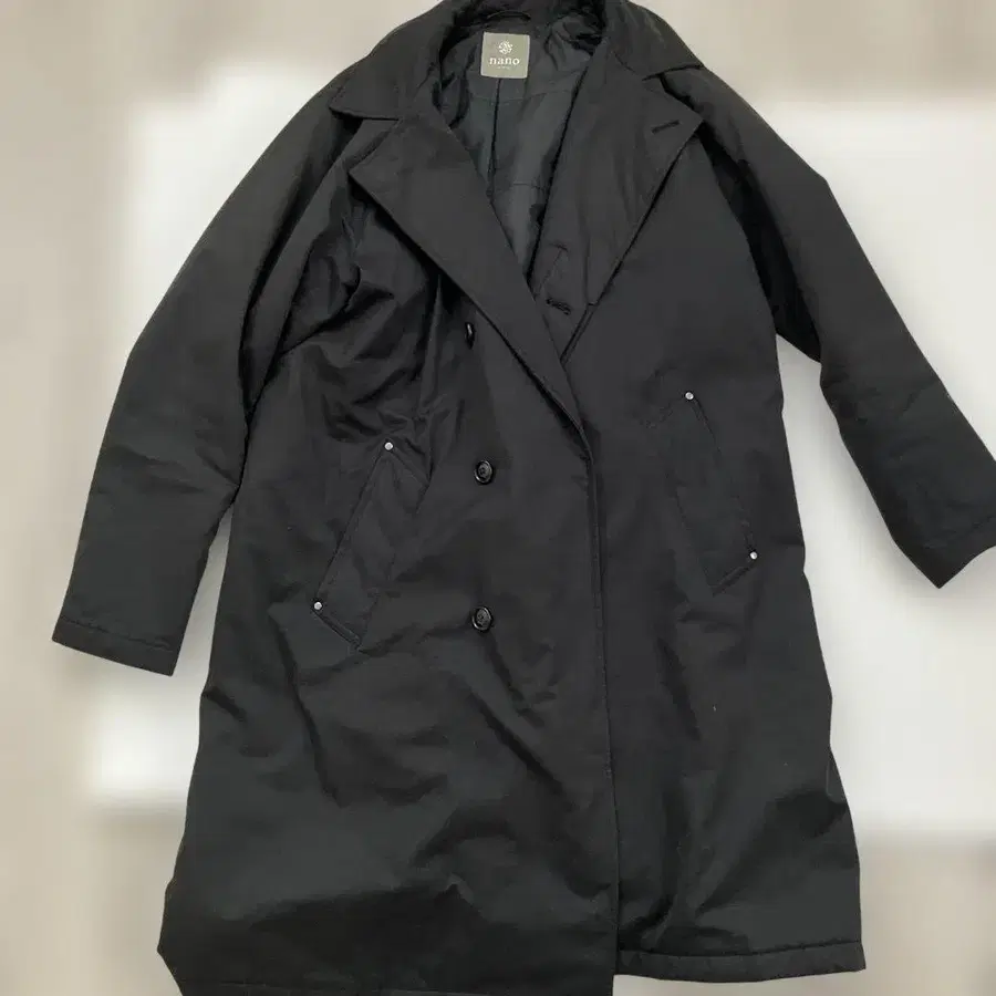 나노 유니버스 심플한 디자인의 약간 두께감 있는 트렌치코트입니다. 블랙 색상. 목 부분에 약간 사용감이 있지만 그 외에는 깨끗한 상품입니다. m(_ _)m