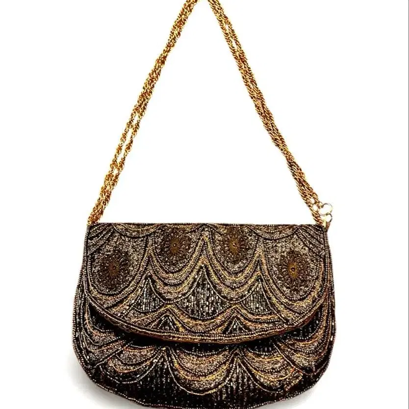 골드와 차분한 색감의 비즈 장식이 아름다운 파티, 결혼식에 최적인 백. 블랙과 골드를 기조로 한 아름다운 비즈 장식입니다. 체인을 분리하여 클러치백으로 사용하거나, 길게 늘여 숄더백으로, 짧게 하여 핸드백으로도 활용 가능합니다. 크기: 20 x 15 체인 길이: 이중으로 60, 단일로 120. 방문해 주셔서 감사합니다.