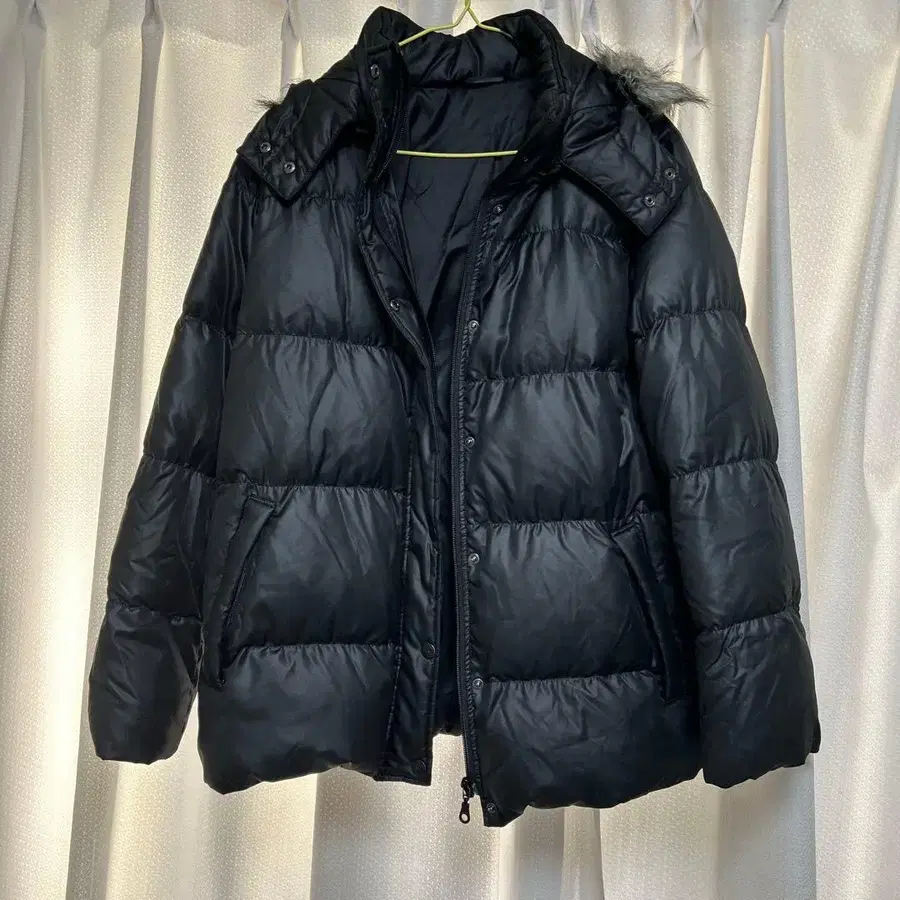 후드 부착 블랙 다운 자켓, XL 사이즈, 퀼팅 디자인.