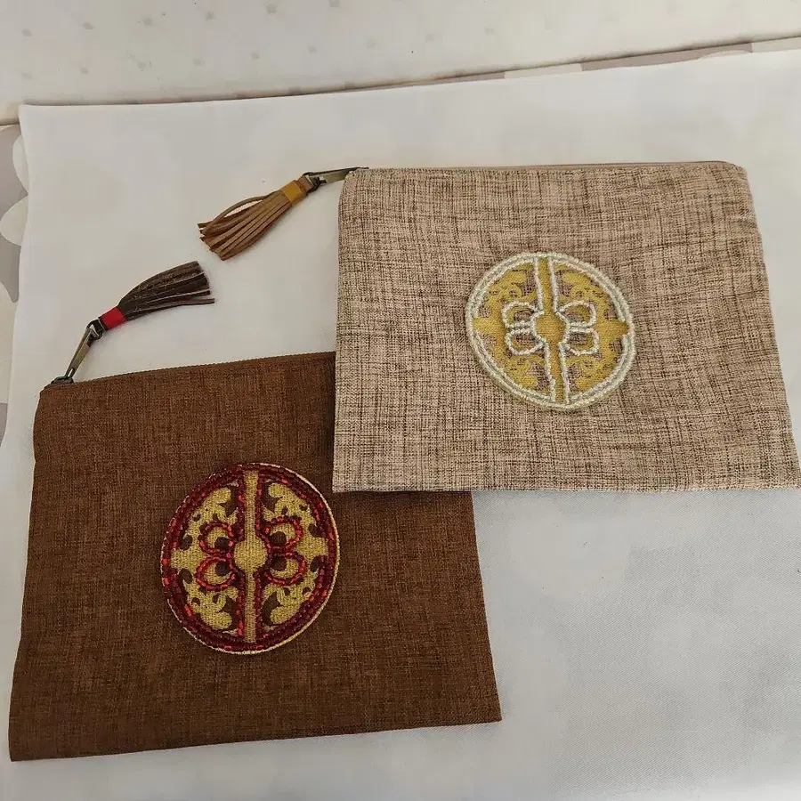자수와 문자 무늬가 들어간 린넨풍 파우치, 태슬이 달려 있어 멋스럽습니다.