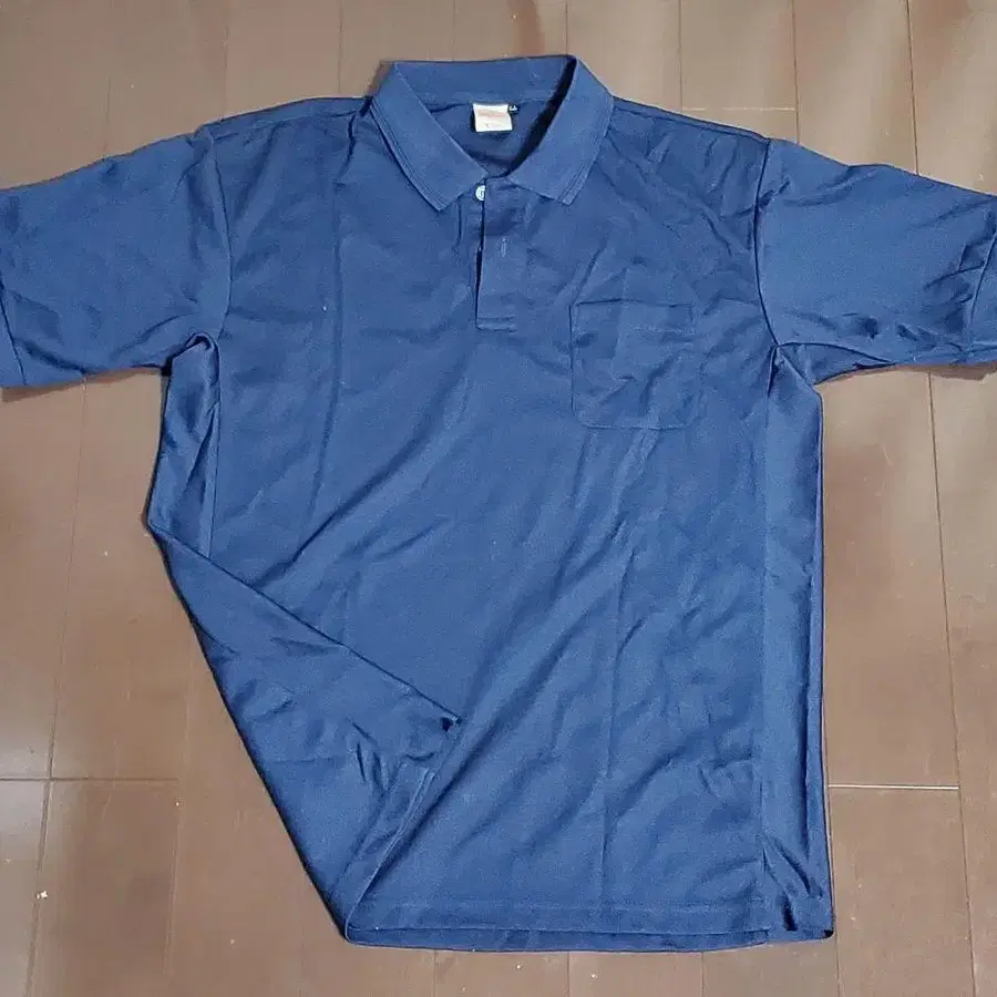 네이비 색상의 피케 셔츠, 포켓 부착, 폴리에스테르 소재.