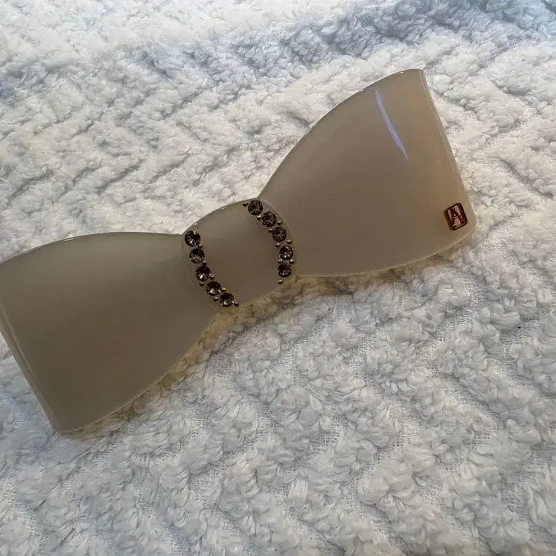 베이지 계열 크림색 ✖️ 골드 레터링의 리본형 헤어 클립, 10cm, 프랑스제 스톤 장식 포함.