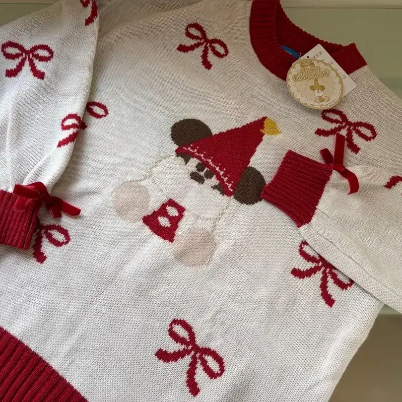 미사용 새상품인 미키의 크리스마스 디자인 스웨터입니다. 소매에 빨간색 리본이 달려 있어 귀엽습니다. 정가는 7,000엔입니다. 크리스마스용 머리띠도 판매하고 있습니다.